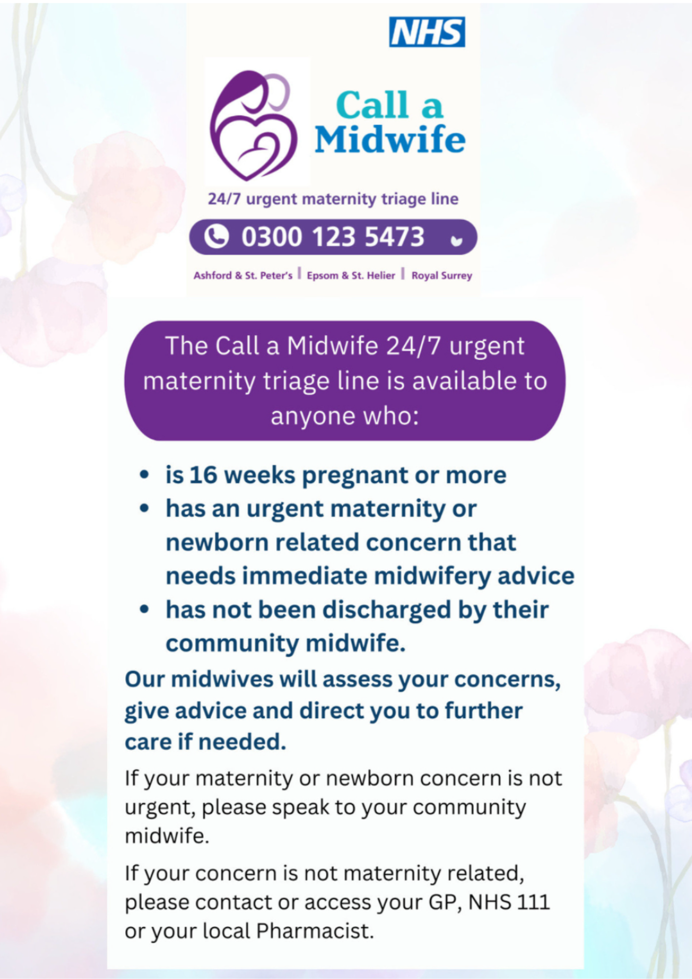 The Call a Midwife 24/7 urgent maternity triage line is available to anyone who: