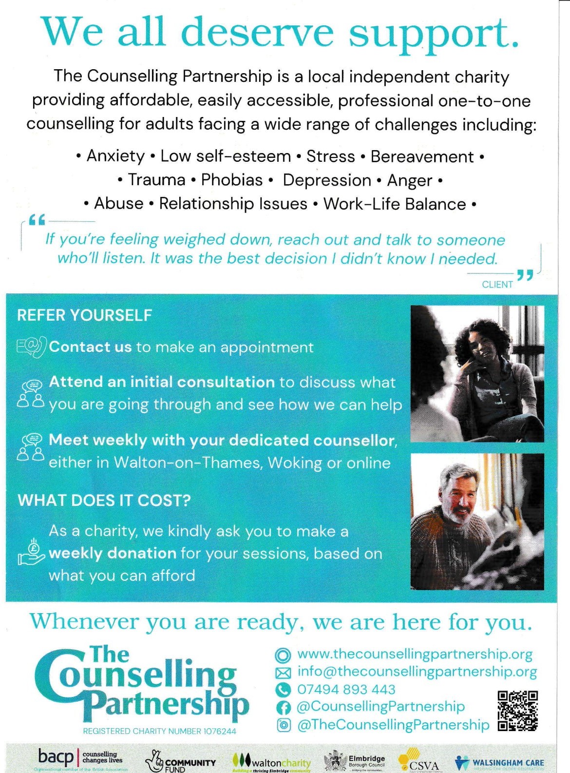 To contact please call 07494 893 443 or email info@thecounsellingpartnership.org